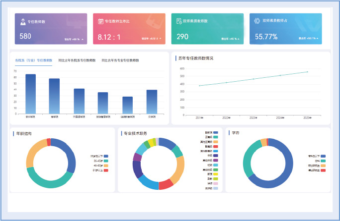 提供年龄、学历、专业技术职务等多维度的动态可视化管理视图,支持多条件筛选与联动下钻。