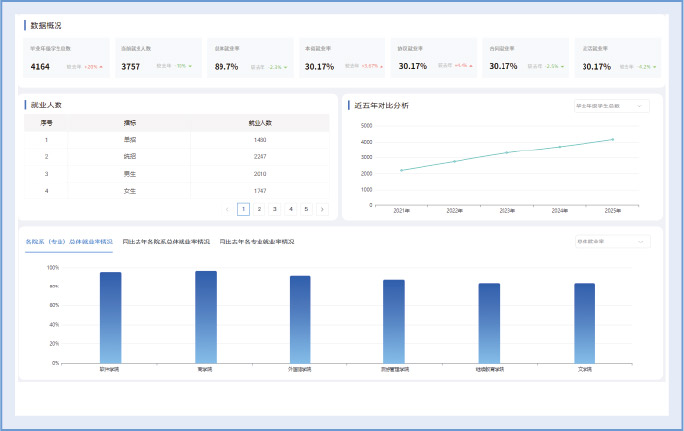 从总体、院系到专业大类,贯穿全过程动态监测就业率,客观展示优势院系、薄弱环节及排名变化轨迹。