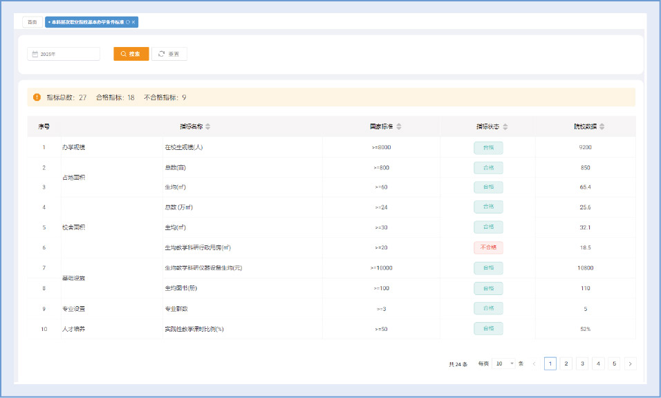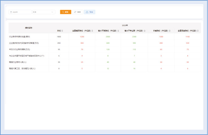 支持课程、专业等教学数据与全国各类院校中位数数据进行对比,直观定位自身水平。