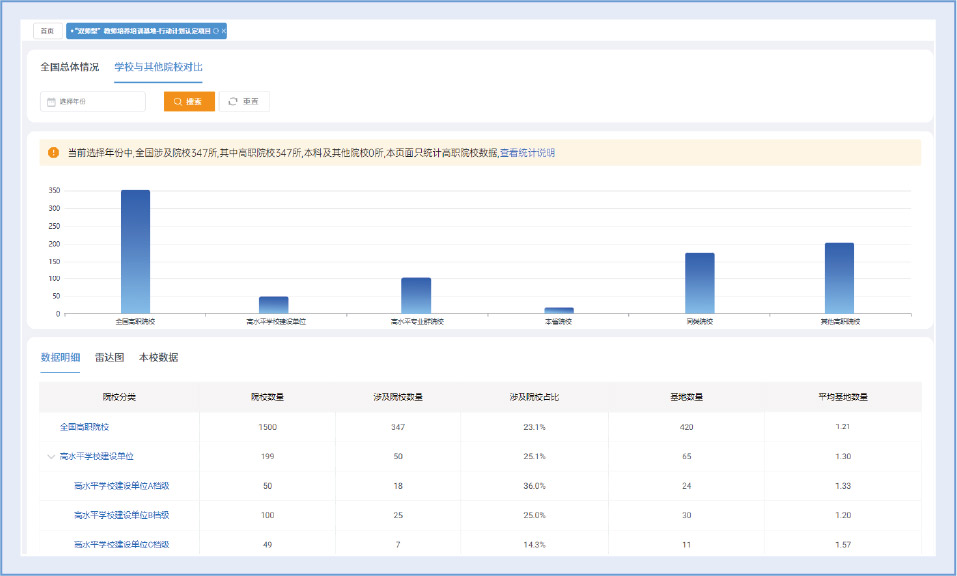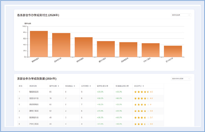 支持在专任教师赴境外交流、中外合作办学专业数、国(境)外技能大赛获奖等关键指标上与全国同类院校对比,找准国际化的位置与差距。