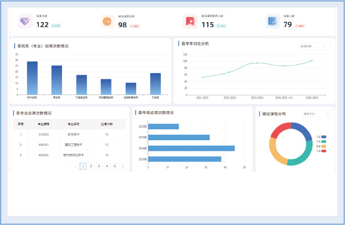 集成巡课、评教、成绩分析等多维度数据,建立“监测-评价-反馈-改进”的教学质量闭环管理机制。