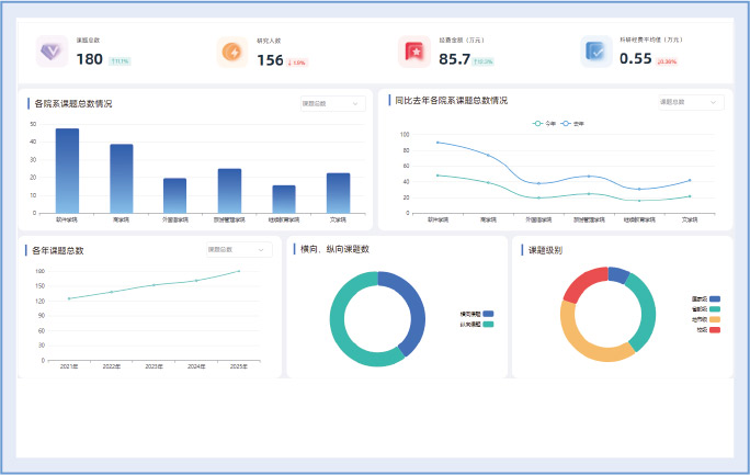 从课题级别、经费到款、成果产出等维度全面评估学校的科研与社会服务能力。