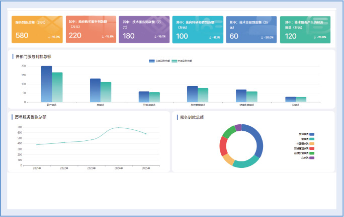 实现各系部技术服务到款总额的分项对比及年度趋势分析,清晰呈现技术服务的经济效益。