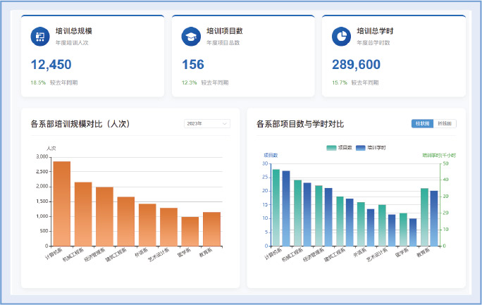 对继续教育、社会培训等各类培训服务的规模、项目数、学时进行量化管理与分析。
