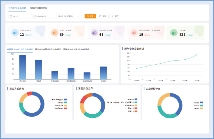 从企业规模、投资方式、行业分布等多角度分析合作企业结构,评估校企合作的广度与深度。