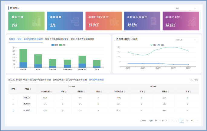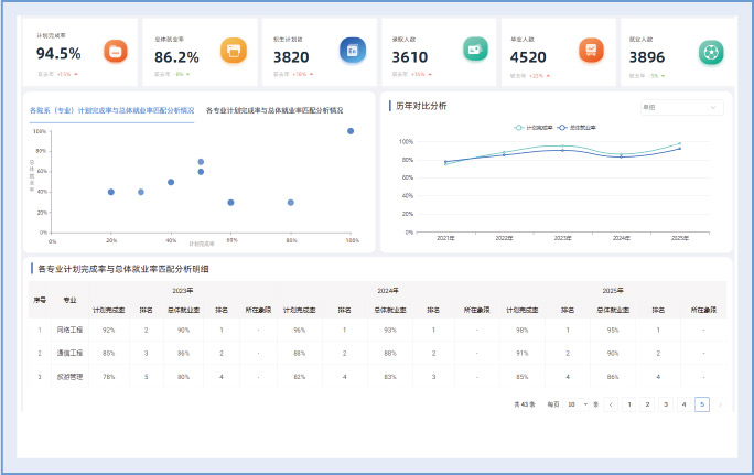 综合 “新生报到率”、“就业率”、“协议就业率” 等核心指标,量化评估各专业的社会认可程度,指导专业优化与调整。