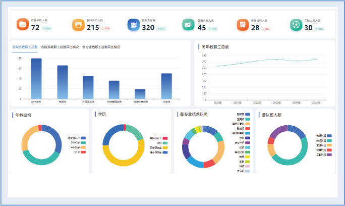 提供年龄、学历、专业技术职务等多维度的动态可视化管理视图,支持多条件筛选与联动下钻。