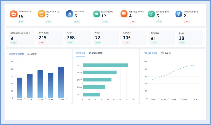 对省级骨干教师、教学名师、教学团队、教科研成果等关键指标进行趋势分析,清晰展示师资队伍建设成效。