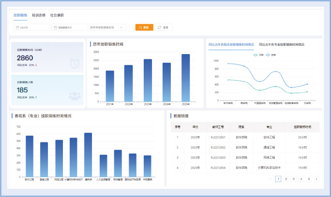 对教师挂职锻炼、培训进修、社会兼职等进行记录与分析,为教师个人发展与学校政策制定提供依据。