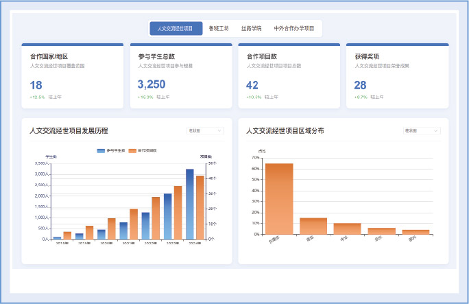 标志性成果专项分析对“人文交流经世项目”、“鲁班工坊” 等国际化品牌项目的成果进行专项分析与展示。